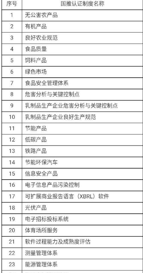 国推自愿认证是指由国家认证认可行业管理部门制定相应的认证制度,经批准并具有资质的认证机构按照“统一的认证标准、实施规则和认证程序”开展实施的认证项目。目前由认监委批准的国推自愿性认证项目共25项,如下表所示: