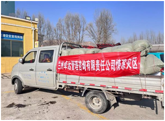 兰州卓远管理咨询有限责任公司在了解到灾区受灾情况后,立刻研究筹备救灾专款,同时在公司内部发起爱心捐赠倡议。2023年12月20日,在总经理张建萍带领下卓远全体员工慷慨解囊进行捐款。考虑到灾区天气严寒、急需生活物资,公司决定紧急采购棉大衣、清真食品以及女士卫生用品送往灾区。